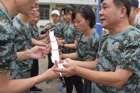 參訓(xùn)人員隨機(jī)分配為3支隊(duì)伍,經(jīng)過各小組的一番頭腦風(fēng)暴,“旗艦隊(duì)”、“全勝戰(zhàn)隊(duì)”、“陽(yáng)光隊(duì)”分別以其響亮的口號(hào)和別出心裁的隊(duì)形一一精彩亮相。在團(tuán)建活動(dòng)中,先后進(jìn)行了趣味破冰、挑戰(zhàn)150、水果連連看、決戰(zhàn)沙場(chǎng)和團(tuán)隊(duì)能量圈等多個(gè)項(xiàng)目,活動(dòng)中三支隊(duì)伍齊心協(xié)力,勇闖難關(guān),挑戰(zhàn)了一個(gè)又一個(gè)不可能?!叭の镀票笔箞F(tuán)隊(duì)感情迅速升溫,促進(jìn)了隊(duì)員們彼此之間的交流和信任;“挑戰(zhàn)150”讓隊(duì)員們明白了在遇到“時(shí)間緊任務(wù)重”的突發(fā)情況,團(tuán)隊(duì)如何分工和協(xié)作;“水果連連看”鍛煉了團(tuán)隊(duì)溝通和快速反應(yīng)能力,使隊(duì)員們學(xué)會(huì)如何高效合作;“決戰(zhàn)沙場(chǎng)”讓隊(duì)員們體驗(yàn)到了在企業(yè)中處于不同層級(jí)人員之間應(yīng)如何配合、有效傳遞信息和指令,以及執(zhí)行力對(duì)于完成任務(wù)的重要性。